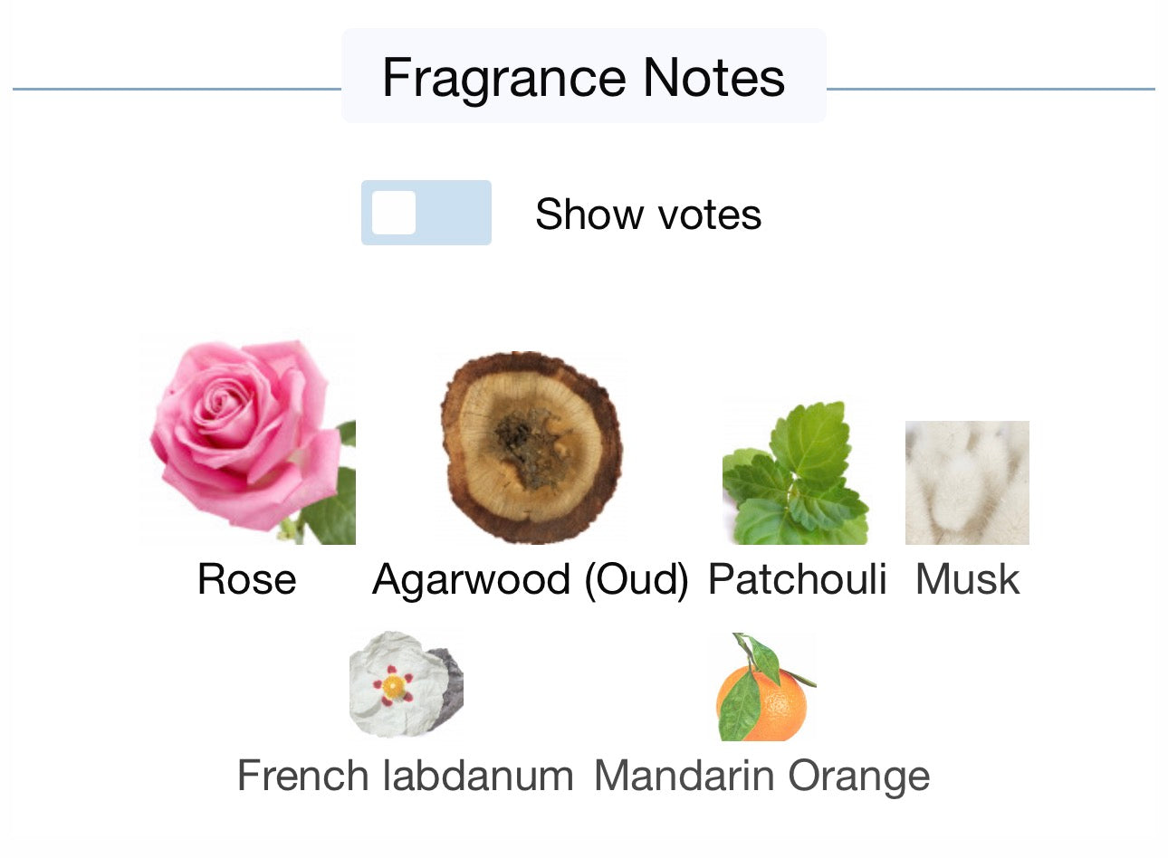 Le note principali sono: Rosa - Legno di Agar (Oud) - Patchouli - Muschio - Labdano Francese - Mandarino