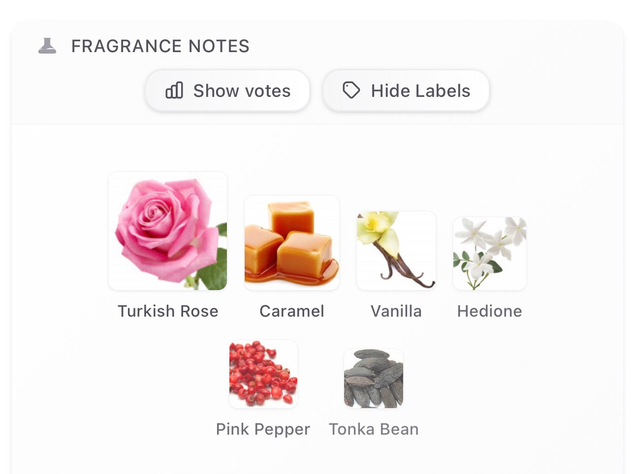 Le note principali sono: Rosa - Pepe Rosa - Hedione - Caramello - Vaniglia