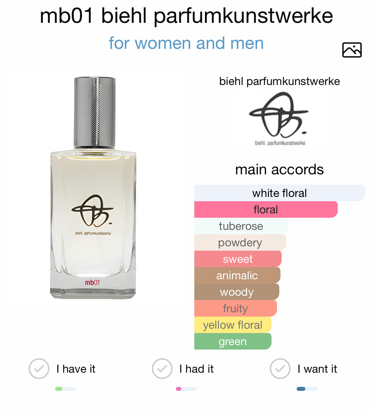mb01 di biehl. parfumkunstwerke è una fragranza del gruppo floreale bianco, floreale unisex. È un Eau de Parfum e il Naso di questa fragranza è Mark Buxton.