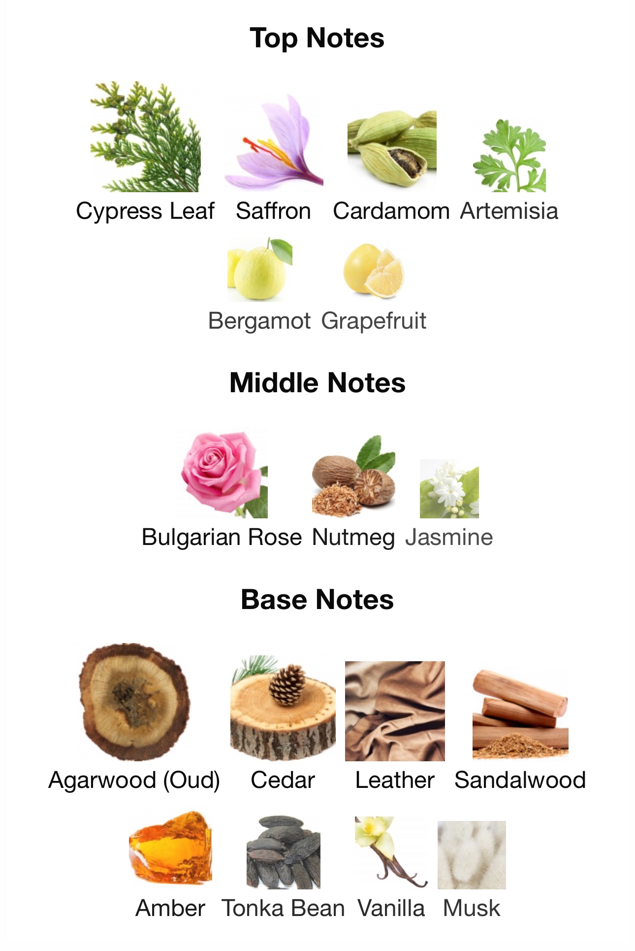 Le note di Testa sono: Foglia di Cipresso - Zafferano - Cardamomo - Artemisia - Bergamotto - Pompelmo