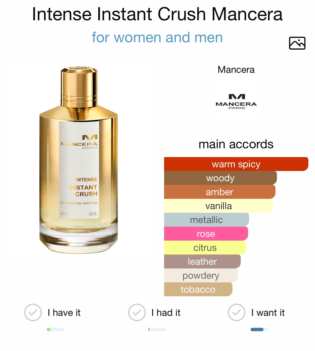 Intense Instant Crush di Mancera è una fragranza del gruppo speziato caldo, legnoso, ambrato unisex. È un Extrait de Parfum e il Naso di questa fragranza è Pierre Montale.