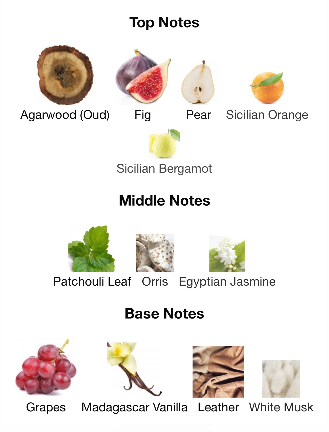 Le note di Testa sono: Arancia di Sicilia - Bergamotto di Sicilia - Pera - Fico del Mediterraneo - Zafferano - Oud