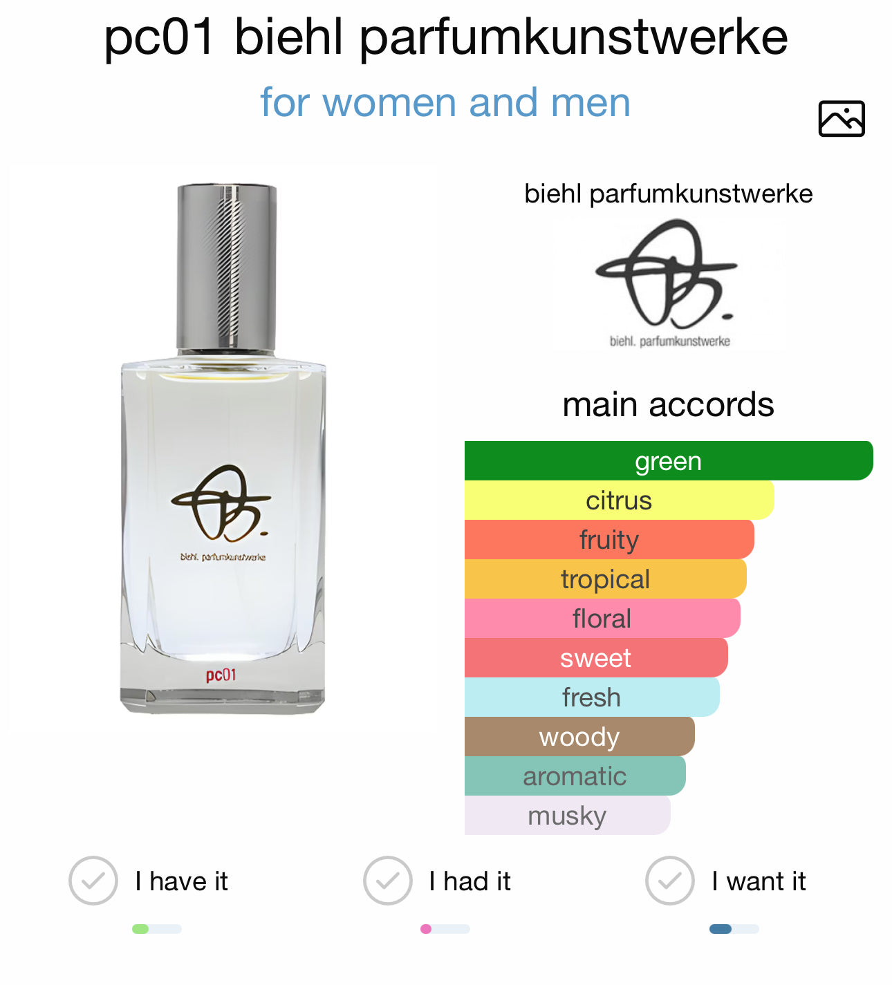 pc01 di biehl. parfumkunstwerke è una fragranza del gruppo verde, agrumato, fruttato unisex. È un Eau de Parfum e il Naso di questa fragranza è Patricia Choux.