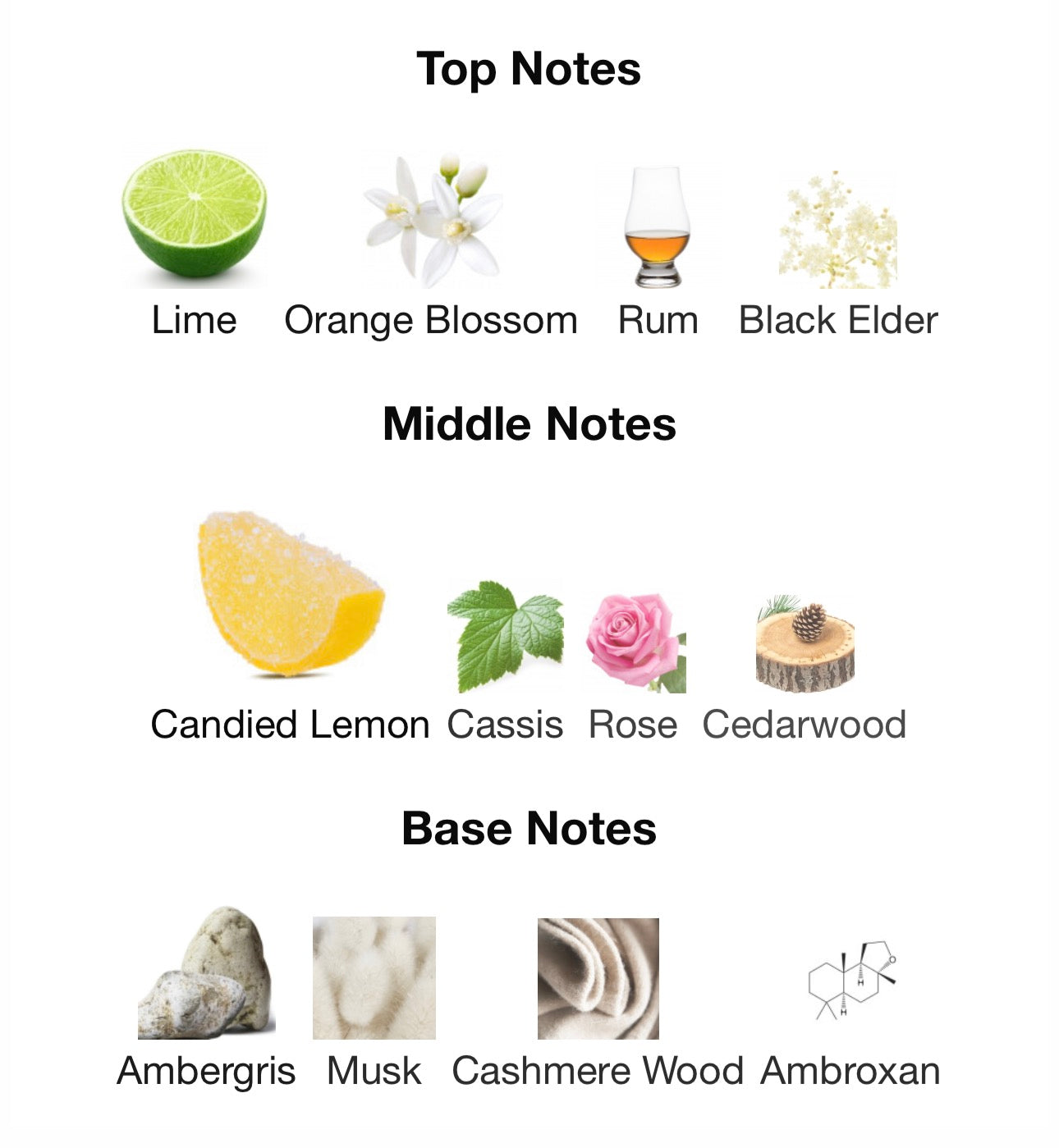 Le note di Testa sono: Lime - Fiore d'Arancio - Rum - Sambuco